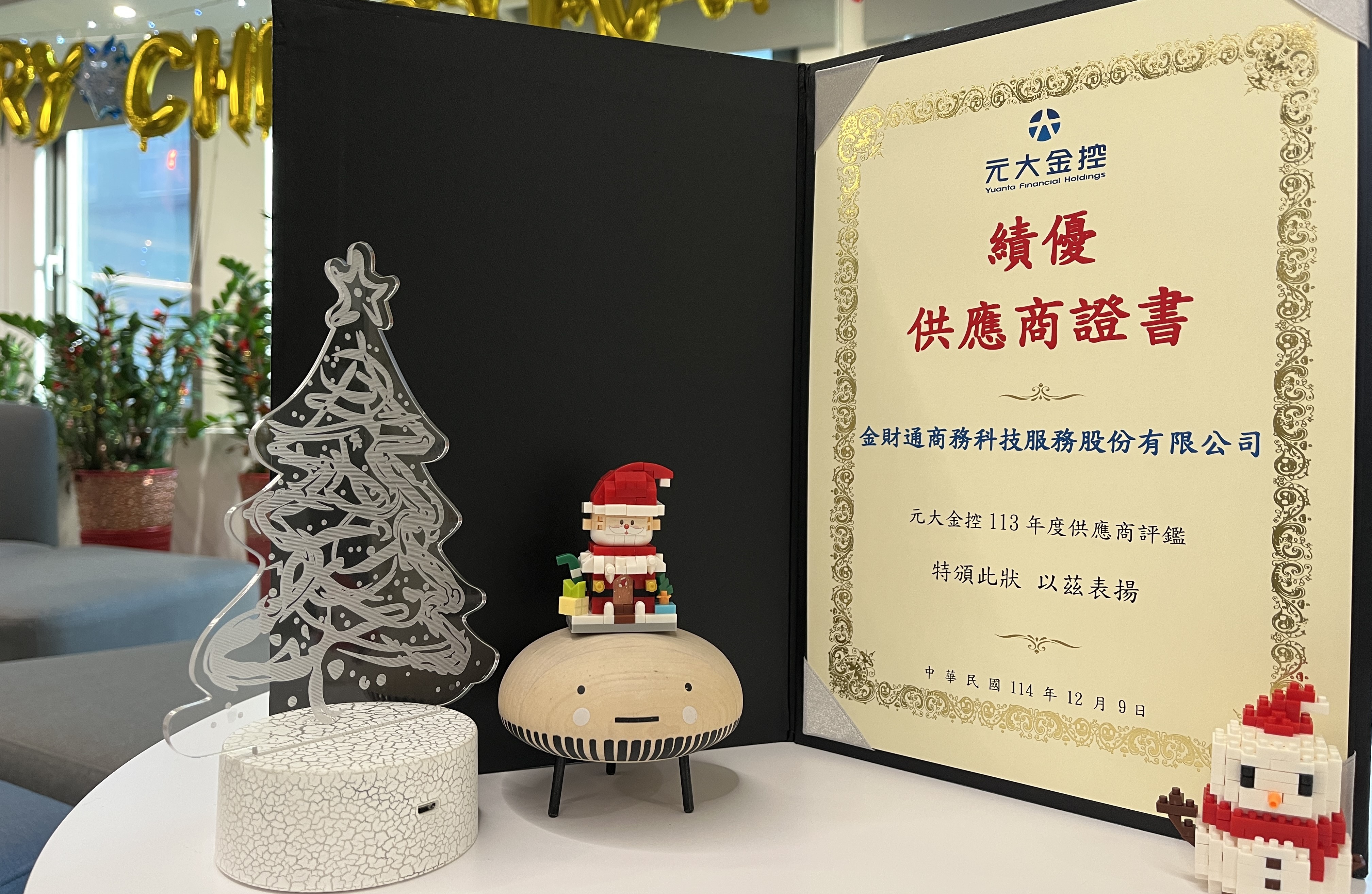 我們很榮幸榮獲元大金控頒發113年度供應商評鑑之「績優供應商證書」。